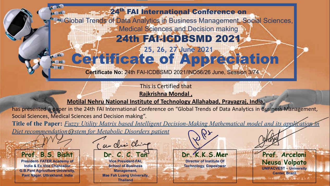 Presented paper Title: Fuzzy Utility Matrix based Intelligent Decision-Making Mathematical model and its application in Diet recommendation system for Metabolic Disorders patient
